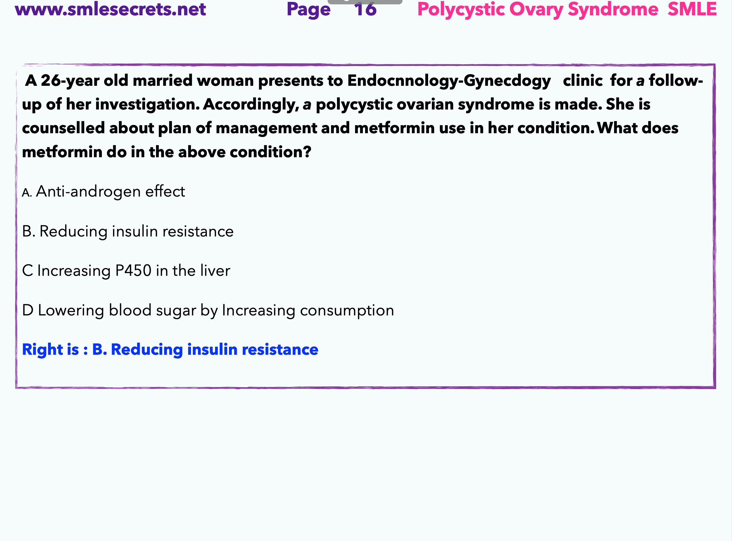 Q14- A 26-year old married woman presents to Endocnnology-Gynecdogy clinic for a follow-up of her investigation. Accordingly, a polycystic ovarian syndrome is made. She is counselled about plan of management and metformin use in her condition. What does metformin do in the above condition