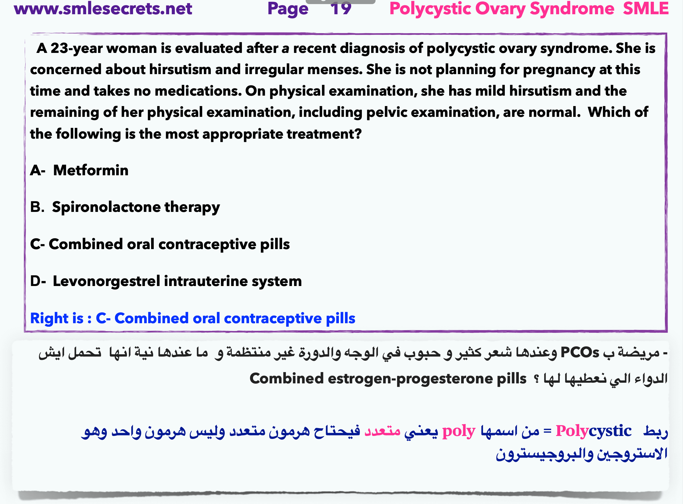 Q13- A 23-year woman is evaluated after a recent diagnosis of polycystic ovary syndrome. She is concerned about hirsutism and irregular menses. She is not planning for pregnancy at this time and takes no medications. On physical examination, she has mild hirsutism and the remaining of her physical examination, including pelvic examination, are normal. Which of the following is the most appropriate treatment